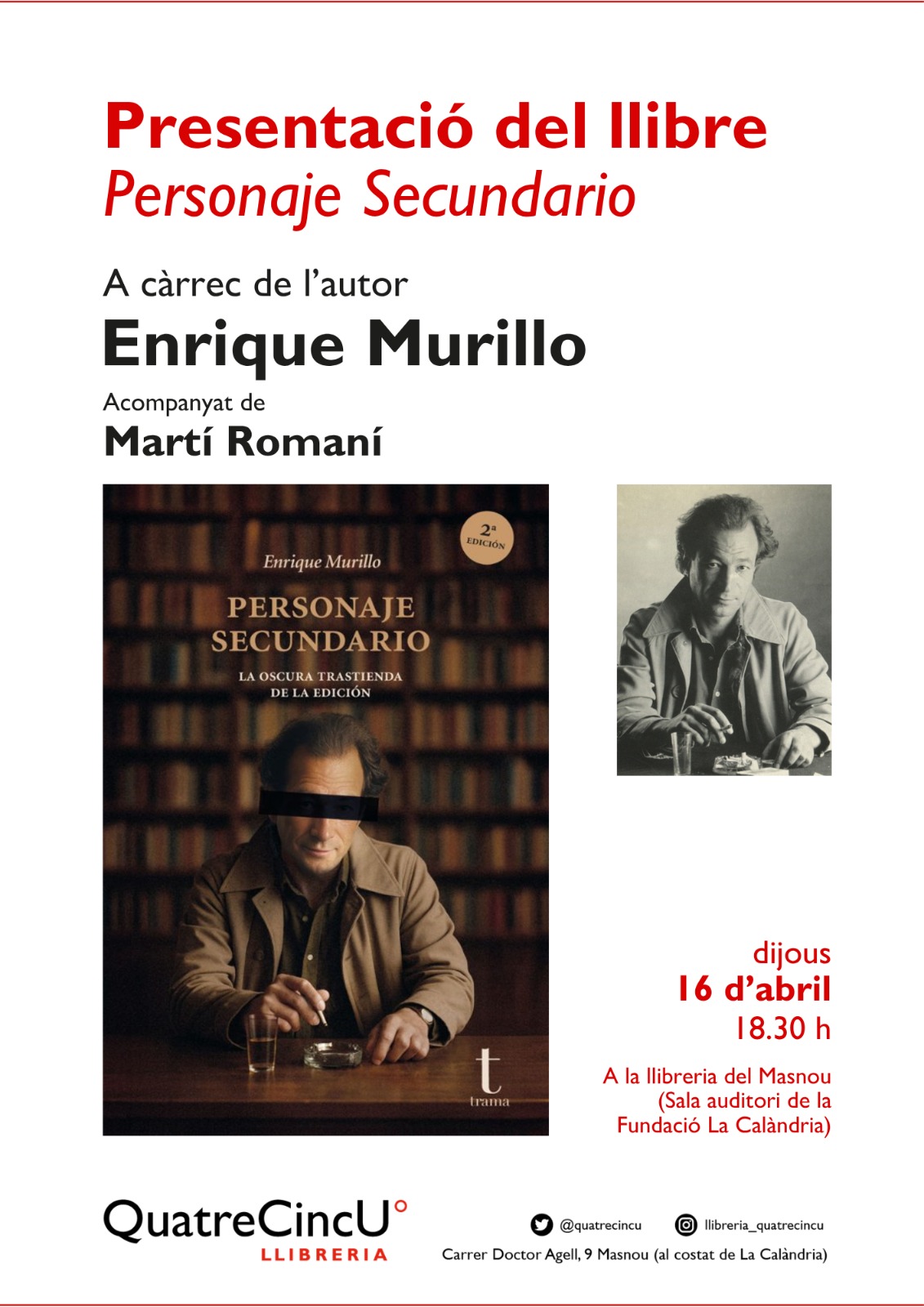 Llibreria QuatrecCincu c/. Doctor Agell, 9 El Masnou a la Sala auditori La Calàndria (entrada per la llibreria) Personaje secundario Pocas veces se ha contado cómo es de verdad el mundo de la edición, cómo funciona su trastienda, qué pasa en los comités editoriales y en los consejos de administración, qué ocurre con los derechos de autor, con los premios llamados literarios… Pero, por fin, en este libro se habla claro de las virtudes y defectos de este universo visto desde dentro. Pues, a través del relato personal de cierto Personaje secundario (un tal Enrique Murillo, editor, traductor, escritor, periodista cultural…), en estas páginas se recorre medio siglo de vida editorial, incluyendo los extraños placeres y las muchas miserias de un sector tan sobrevalorado como desconocido.Jorge Herralde y Javier Marías; Carmen Balcells y su póker de ases; Arturo Pérez-Reverte y Terenci Moix; Oriana Fallaci y Salman Rushdie; los libros El Rey y La Reina… pero también Nabokov y Bret Easton Ellis, Pisón, Pombo y Loriga, son algunos de los protagonistas de la historia que cuenta «Enrique Murillo, el lince de la edición» (Lucía Lijtmaer). «Este es un libro que se leerá por generaciones y, si no, al tiempo» [Fernando R. Lafuente, ABC] «Es valiente, pero por fortuna no se agota en esta valentía ni el interés ni el mérito del libro» [Domingo Ródenas, El País] «Es lo más morboso que ha llegado a las librerías en mucho tiempo. Nadie se salva» [Álex Sàlmon, El Periódico] «Ha dado en el clavo…» [Álvaro Colomer, Zenda] «De secundario, nada» [Ramón de España, Crónica Global] «Describe con humor un mundo en el que se dan odios africanos, celos incomprensibles y maniobras dignas de una novela de espías» [César Coca, El Correo] «El editor que lo confesó (casi) todo» [Xavi Ayén, La Vanguardia] «Ameno, interesante, entretenido, una pieza fundamental al puzle de nuestra historia cultural» [Laura Freixas] «Una novela de novelas…» [Ray Loriga] Esta obra ha recibido una ayuda del Ministerio de Cultura, a través de la Dirección General del Libro, del Cómic y de la Lectura.