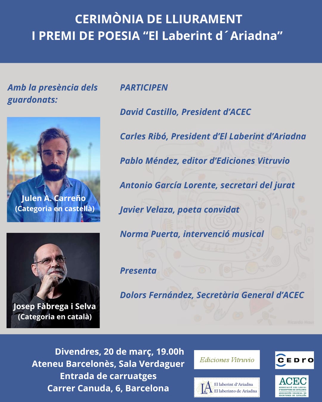 Lliurament del 1er. Premi de Poesia ''El Laberinto de Ariadna'' (català i castellà)