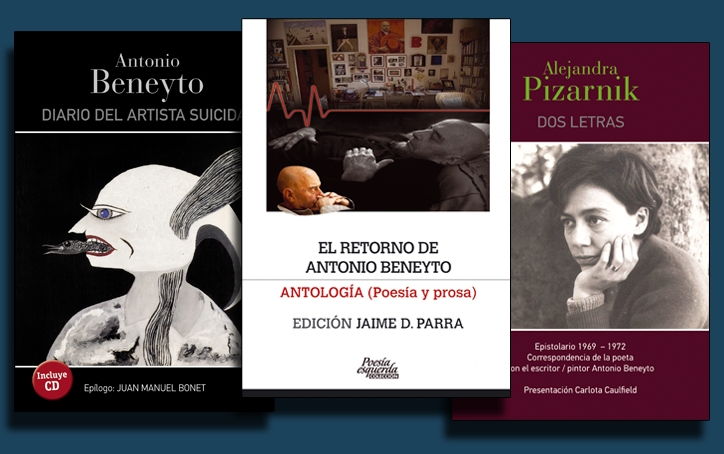 res libros publicados recientemente del creador Antonio Beneyto, artista postista de larga trayectoria de quien hemos dado forma y vida a su Diario del artista suicida, misterioso en sus viajes y relaciones, ocultos hasta ahora. Secretos y recuerdos de lo más íntimo. También El retorno deAntonio Beneyto, antología de poesía y prosa. Fantástico recopilatorio de sus escritos más rompedores. Selección y colaboración estrecha con la editorial de Jaime D. Parra. Y el tercer libro Dos letras, precioso epistolario con la poeta argentina Alejandra Pizarnik... intimista de una relación que mantuvieron a distancia hasta la última carta pendiente de enviar en el escritorio de Pizarnik.